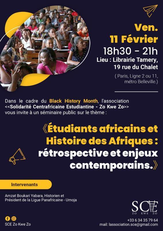Dans le cadre du Black History Month, l’association « Solidaroté Centrafricaine estudiantine Zo Kwe Zo » vous invite à un séminaire public.